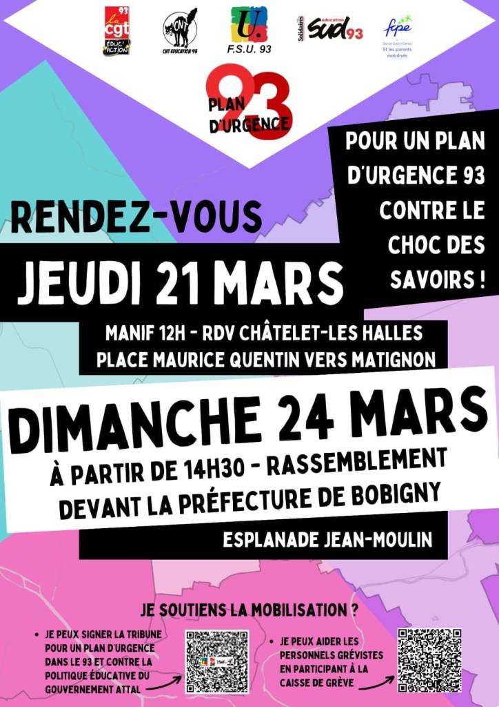 16h – Assemblée générale de l’Éducation 93, salle Hénaff, annexe de la bourse du travail de Paris, 29 Bd du Temple. - SAMEDI 23 MARS :