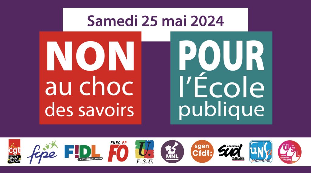 – Journée de mobilisation nationale « contre le choc des savoirs, pour le choc des moyens et des salaires pour l’École publique », à l’appel de l’intersyndical Sud Education, UNSA, FSU, SGEN-CFDT, CGT Educ’action. - MARDI 28 MAI