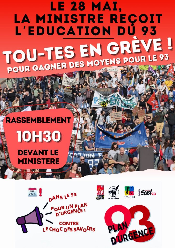 – Grève et mise à l’arrêt des établissements de Seine-Saint-Denis pour le plan d’urgence 93 et contre la réforme du choc des savoirs. Belloubet a annoncé à l’intersyndicale faire des annonces 1 mois après la rencontre du 15 avril. Montrons à la ministre la force de la mobilisation.