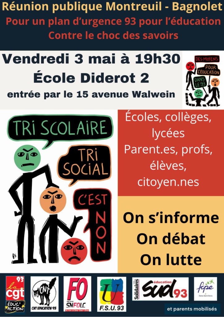– « Soirée à l’école » à l’invitation des parents et personnels éducation mobilisés de Bagnolet pour se retrouver dans un temps convivial pour s’informer, échanger, s’organiser ensemble contre le « choc des savoirs » et pour un Plan d’urgence éducation dans le 93. (voir affiche)